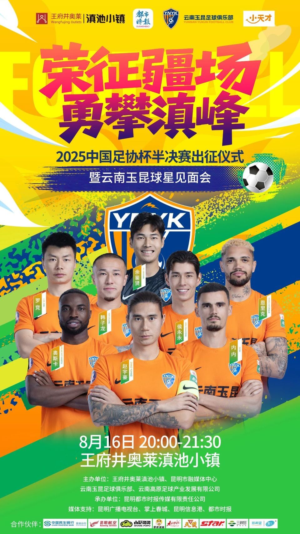 为鼓舞球队士气,凝聚团队力量,并感谢广大球迷的支持,云南玉昆队将于8月16日(星期六)20:00—21:30,在昆明王府井奥莱滇池小镇举行2025中国足协杯半决赛出征仪式暨云南玉昆球星见面会。届时,云南玉昆队主力队员侯永永、恩里克、内内、赵宇豪和球队三位功勋指导区楚良、和云群、和正元等将集体亮相,与广大球迷近距离互动。